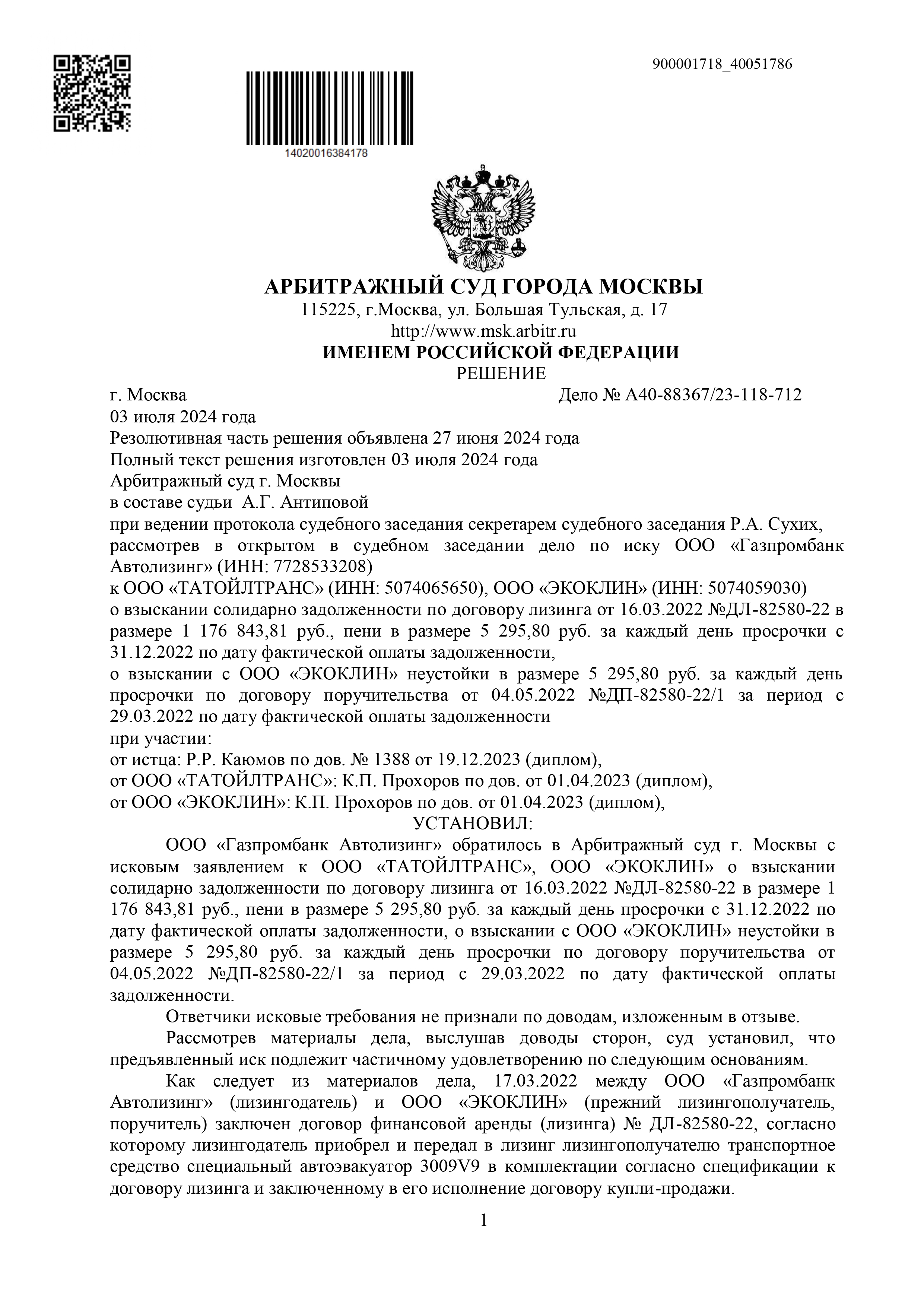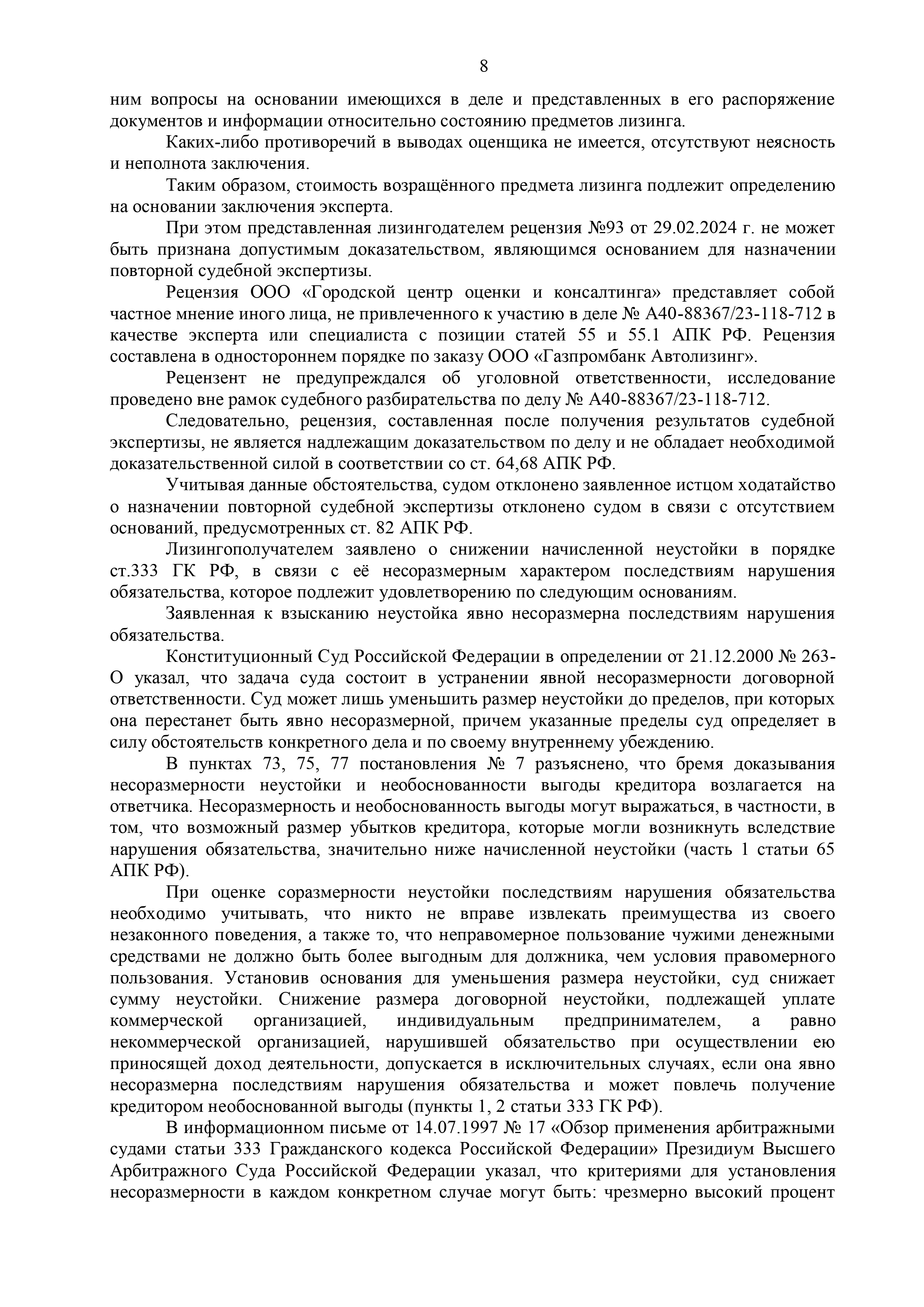 Суд уменьшил сумму взыскания до 207 000 руб. А также взыскал с ООО "Газпромбанк Автолизинг" часть судебных расходов в пользу нашего доверителя 90 000 руб.