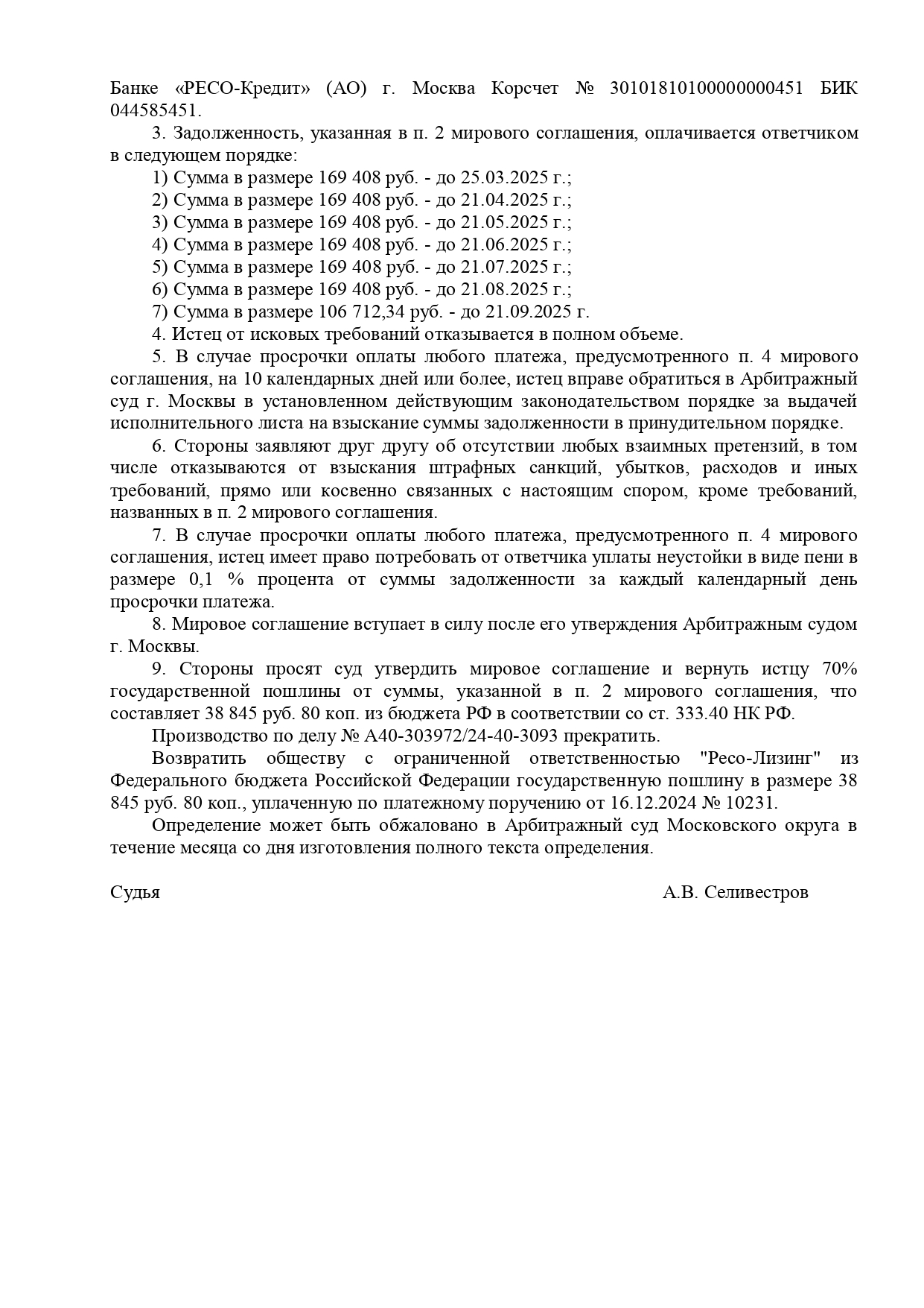 Заключили мировое соглашение в соответствии с которым мы должны выплатить лизингодателю 1 000 000 руб. вместо 2 832 978 руб., а также получили рассрочку на 7 месяцев.