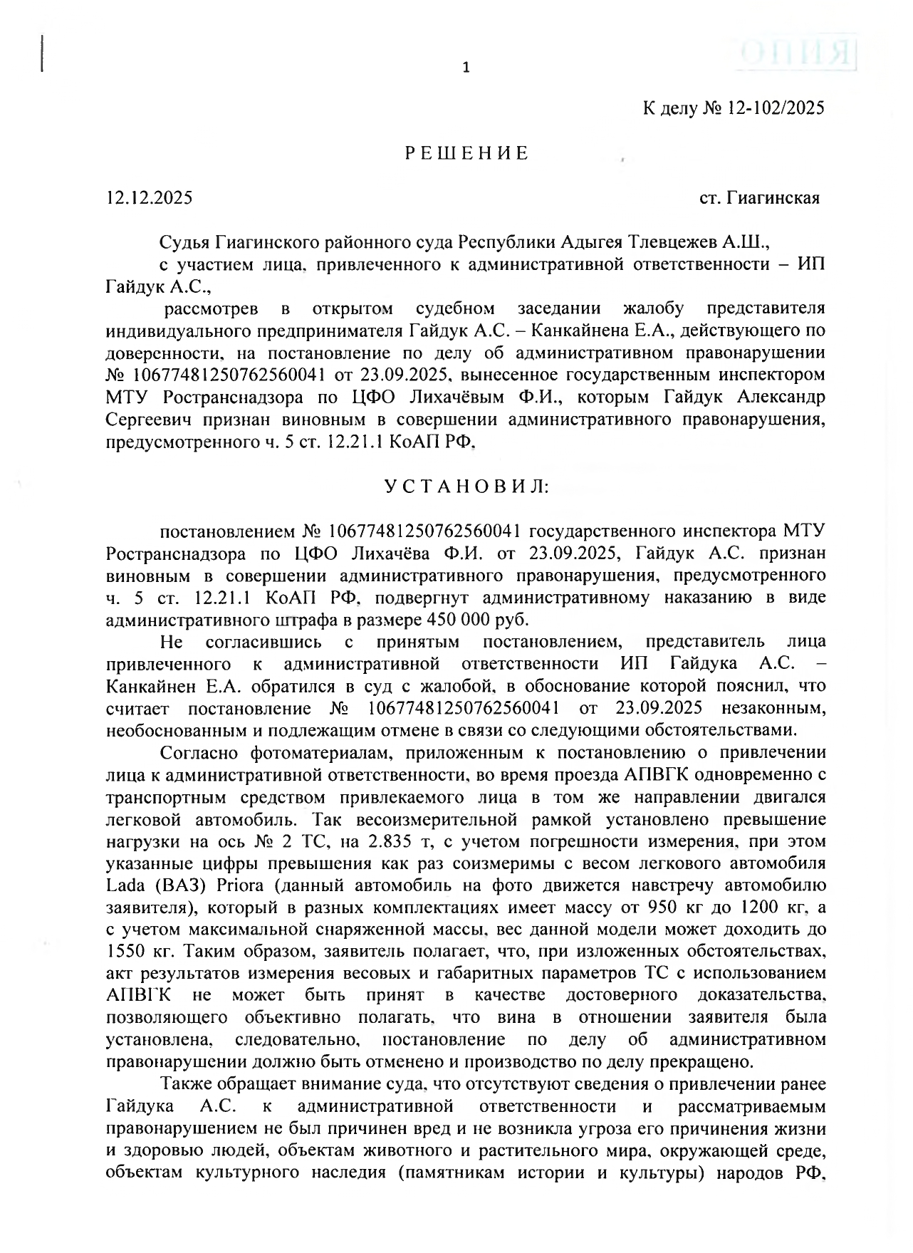Получили штраф в размере 450 000 руб за перегруз.