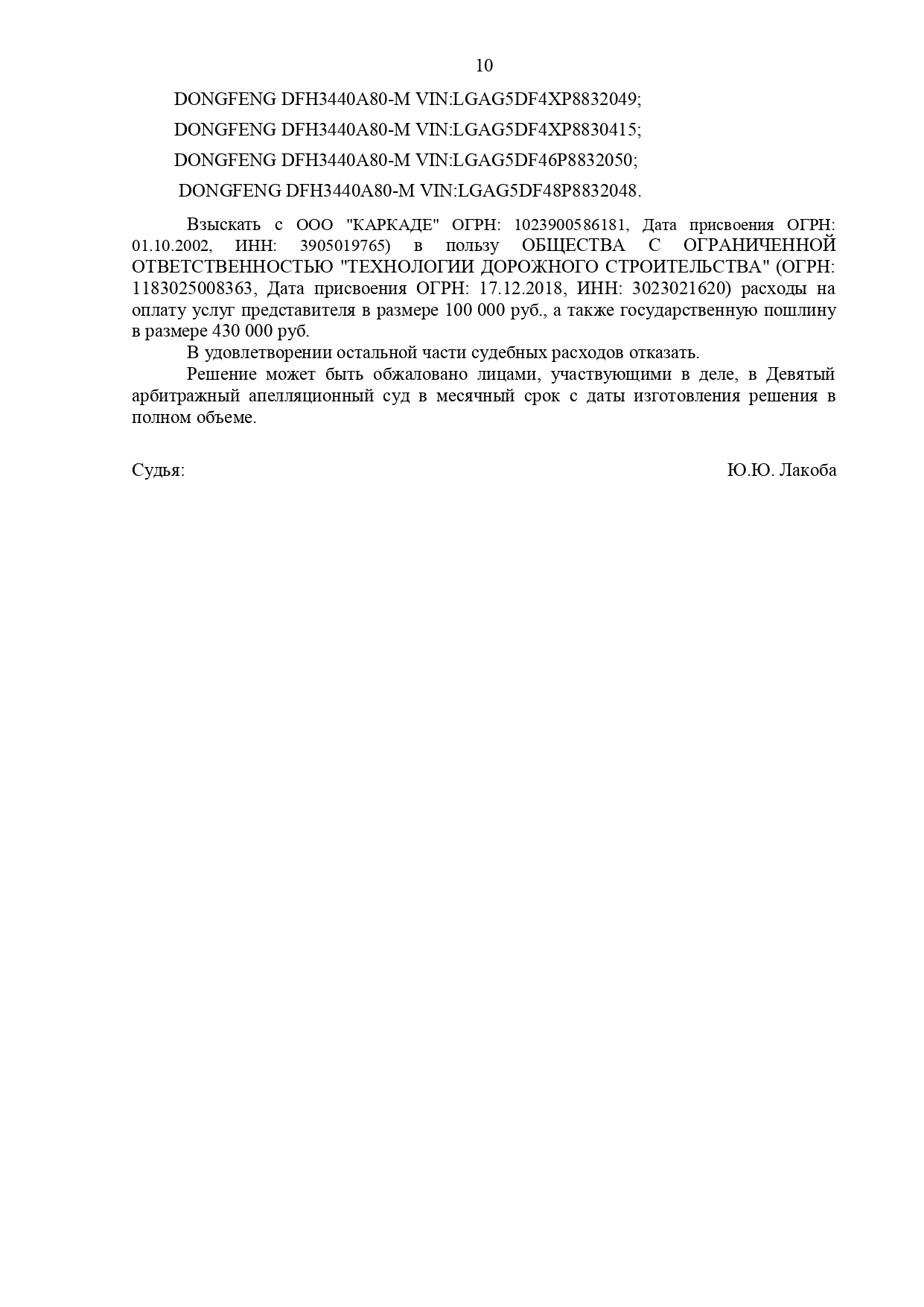 ООО "Каркаде" изъяло 8 Dongfeng у нашего доверителя. Задолженность более двух месяцев была только по одному договору, по остальным полтора.